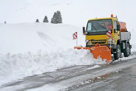 Dvosegmentni snežni plug sa podignutim krajevima sa obe strane.
